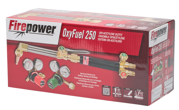 Firepower 350 viene equipado con reguladores de oxígeno y acetileno, mango para soldar, aditamento de corte y boquillas, es decir un paquete integral que le permite al usuario su uso inmediato.